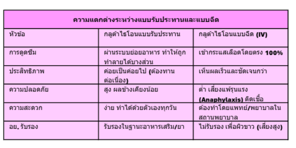 - แบบรับประทาน: ช่วยเพิ่มระดับกลูต้าไธโอนในร่างกาย แต่อาจใช้เวลา 4-6 สัปดาห์จึงจะเห็นผลการรับประทาน: มักถูกย่อยในระบบทางเดินอาหาร ทำให้ดูดซึมได้น้อย ผลลัพธ์อาจไม่ชัดเจน